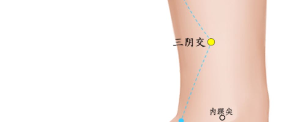 三陰交。在內(nèi)踝向上量4指處,為足太陰脾經(jīng)的腧穴,由于是肝、脾、腎三陰經(jīng)交會處的穴而得名。肝藏血,脾統(tǒng)血,腎藏精,精血相生,因此是治療與血有關(guān)病證的要穴。用補(bǔ)法,有健脾、補(bǔ)血、攝血的作用,類似于當(dāng)歸、阿膠、紫河車、薏米等藥物的功效;用瀉法,有活血化淤的作用,類似于歸尾、桃仁、紅花等藥的功效。