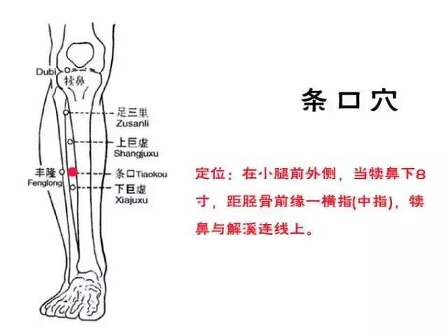 條口穴能鼓舞脾胃中焦之氣,令其透達四肢,祛除風寒濕邪,促使滯澀之經(jīng)脈通暢,通利關節(jié)。尤其適合頸項部活動受限者,在點按刺激的同時應活動頸項部,緩慢重復左右轉頭、抬頭、低頭等動作,每次治療時間10分鐘左右。長期按壓條口穴不僅濡養(yǎng)筋骨,通絡止痛,還可調理脾胃,緩解脘腹疼痛。