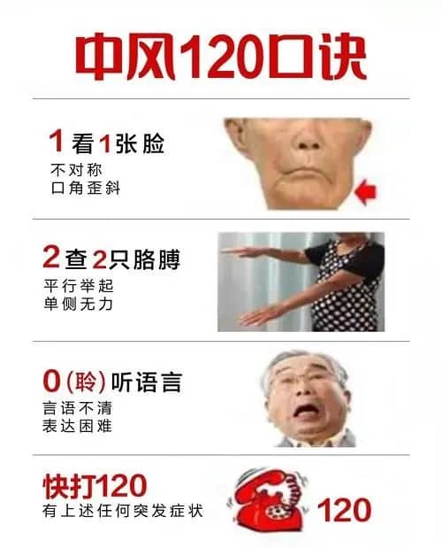 如果有任何一個癥狀突然發(fā)生,極有可能是腦卒中,要立刻撥打急救電話120。