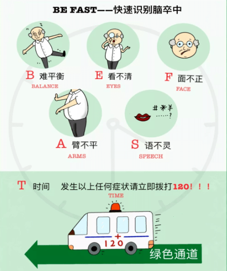 “T”——Time是指時間,上述癥狀提示可能出現(xiàn)卒中,請勿等待癥狀自行消失,而應立即撥打120獲得醫(yī)療救助